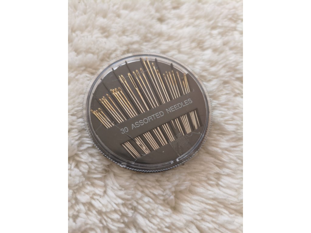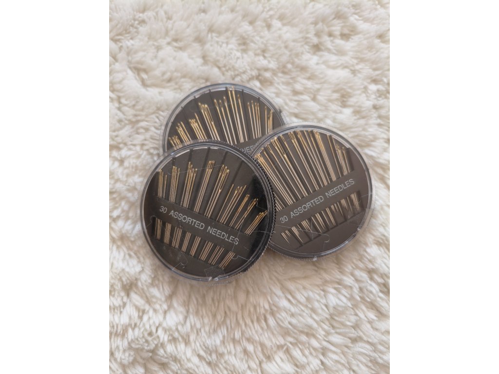Balení jehel různých velikostí v plastové krabičce , jehly mají zlatá očka