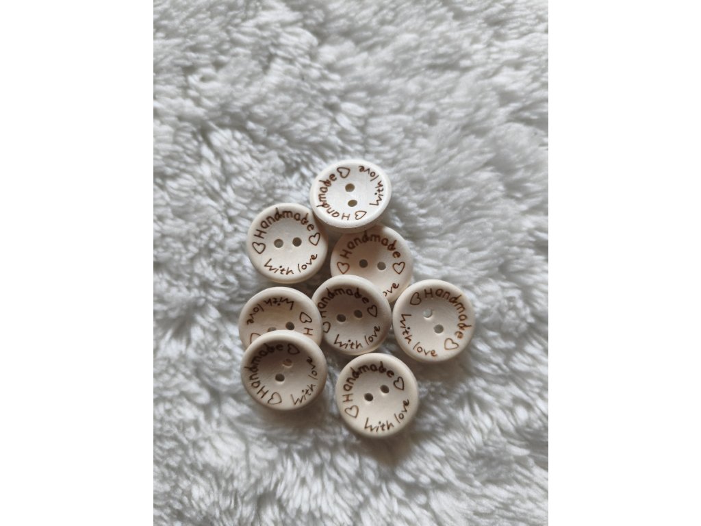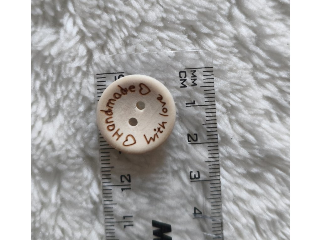 Dřevěný knoflík s nápisem Handmade with love. Průměr 2 cm