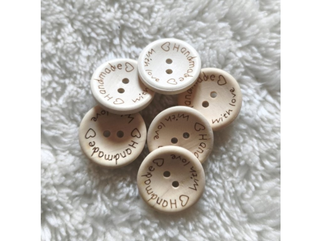 Dřevěný knoflík s nápisem Handmade with love. Průměr 2,5 cm